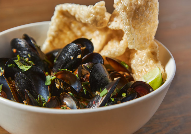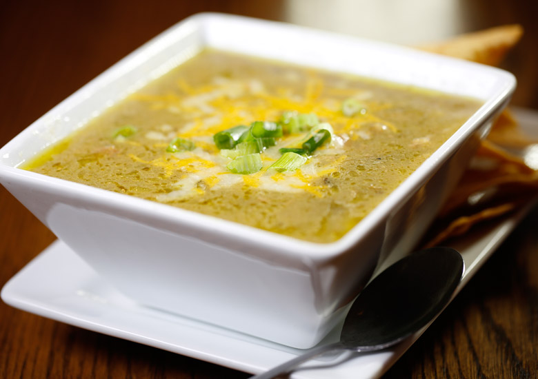 Thickened with masa, roasted hatch green chiles, tortilla chips